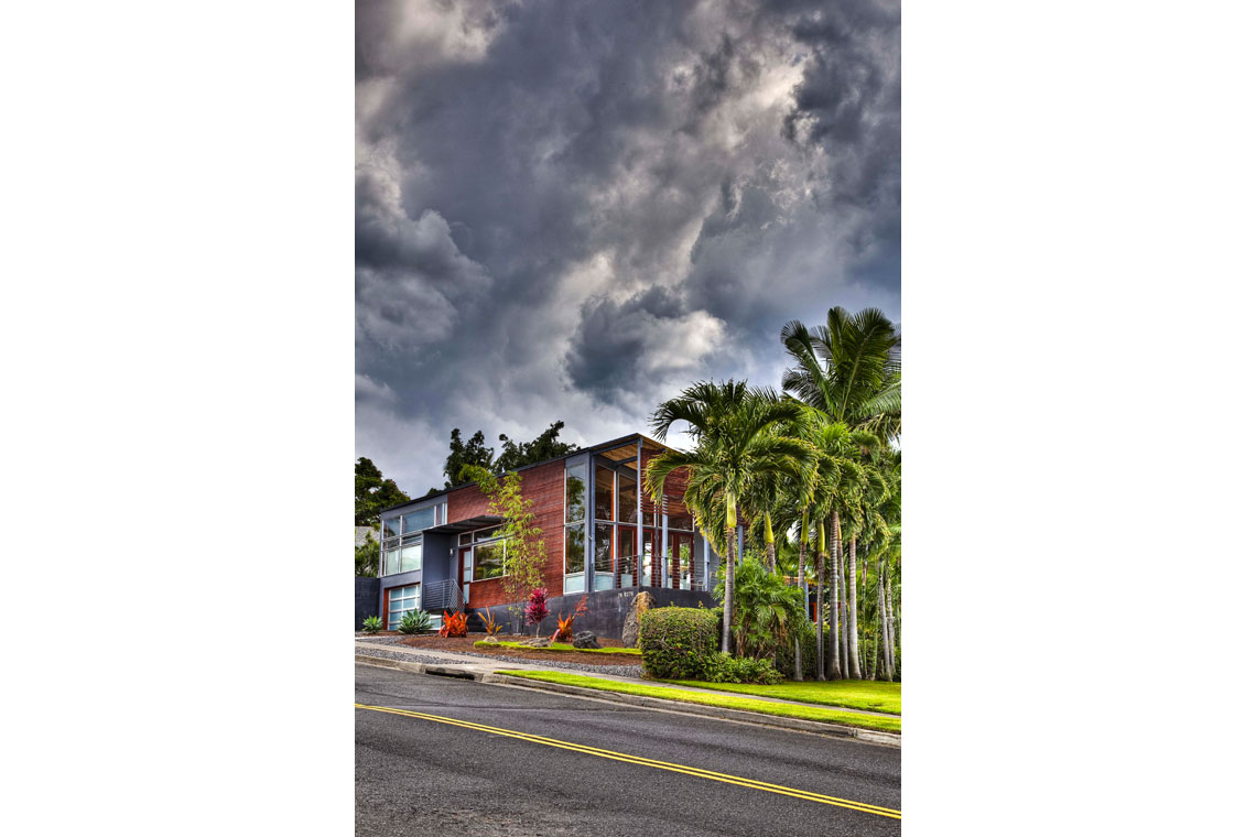 from the local black basalt lava flows, or A’A, that have created all the Hawaiian Islands. I used a modern interpretation of these walls: site-cast monumental concrete walls using a black-pigmented concrete with basalt aggregate. These walls are meant to grow out of the basalt, anchor the site and create a private courtyard within the restrains of a suburban infill lot. The open floor plan allows large expanses of glass to capture views of the beautiful coastline and lush vegetation. Light wood elements provide sun protection and privacy for abundant outdoor living. While the language is modern, the site gestures, attention to regional tradition and detail, make this house unique to its site in Hawaii.