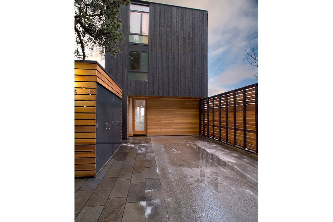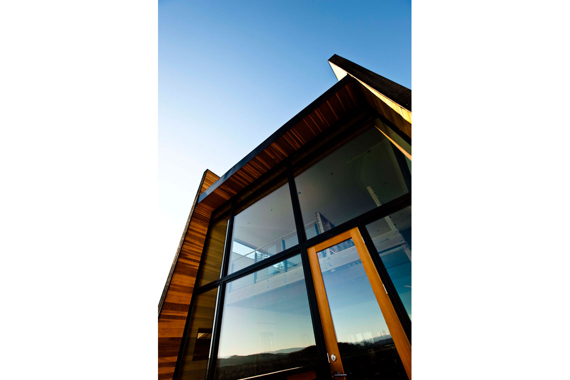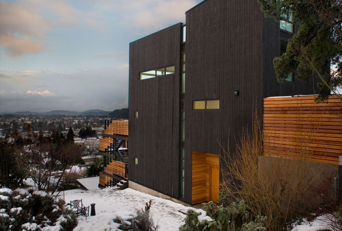 The house is nestled into an infill lot in inner city Portland, on the slope of an extinct volcano, Mt. Tabor. The design strategy was to capture the commanding views of Mt. Hood, Mt. St. Helens, and the entire Cascade Range to the east, while adhering to the tight constraints of a narrow and sloping lot. The lot itself was an old play court for a neighboring ranch house and had existing stonewalls and terraces which the home carefully incorporates into the design. While the house adheres to Modernist design principals of abundant open space and natural light, the project celebrates and features regional Northwest woods. Clad in a dark-stained knotty cedar, the exterior evokes a weathered bark, and blends into a stand of old-growth fir trees behind the house. Erosions into the shell evoke saw-cuts into the interior of a tree. Delicate exposed Douglas Fir framing in the interior showcases a two-story vertical window wall and a floating wood loft and stair.
