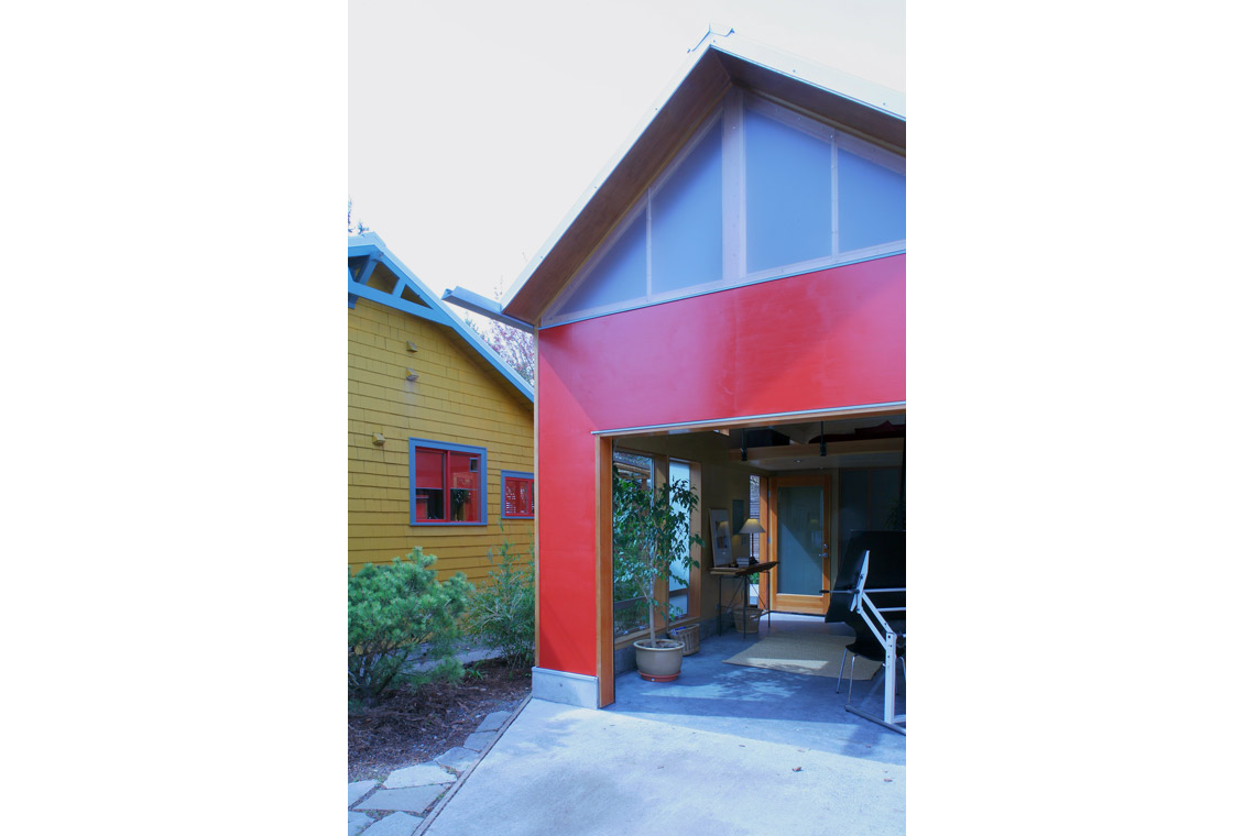 The detached building was designed as a workspace and studio and adds an additional 600 square feet to the adjacent house. Designed with clean lines, modern materials and an open space and loft, the building provides an uplifting alternative to the neighboring