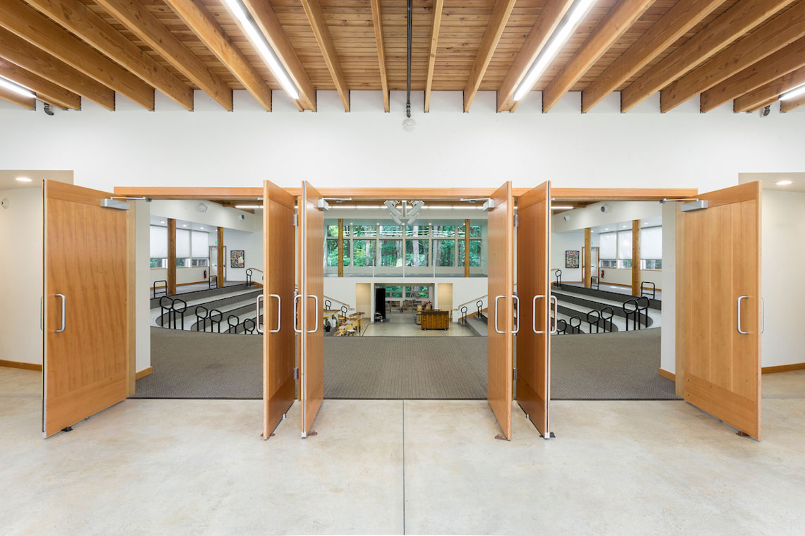 Webster Wilson Architect is the Architect of Record for the new Gathering Center for the Arbor School of Arts & Sciences, an independent K-8th school, located in wooded farmland near Portland. The design team was tasked with creating a multi-function performance hall for a 500 person capacity. The space needed to be flexible and able to accommodate theater productions, music classes, graduations and lectures. The architecture evokes the simple vernacular language of the campus, with honest structural expression and largely wood material palette in its sloping site.